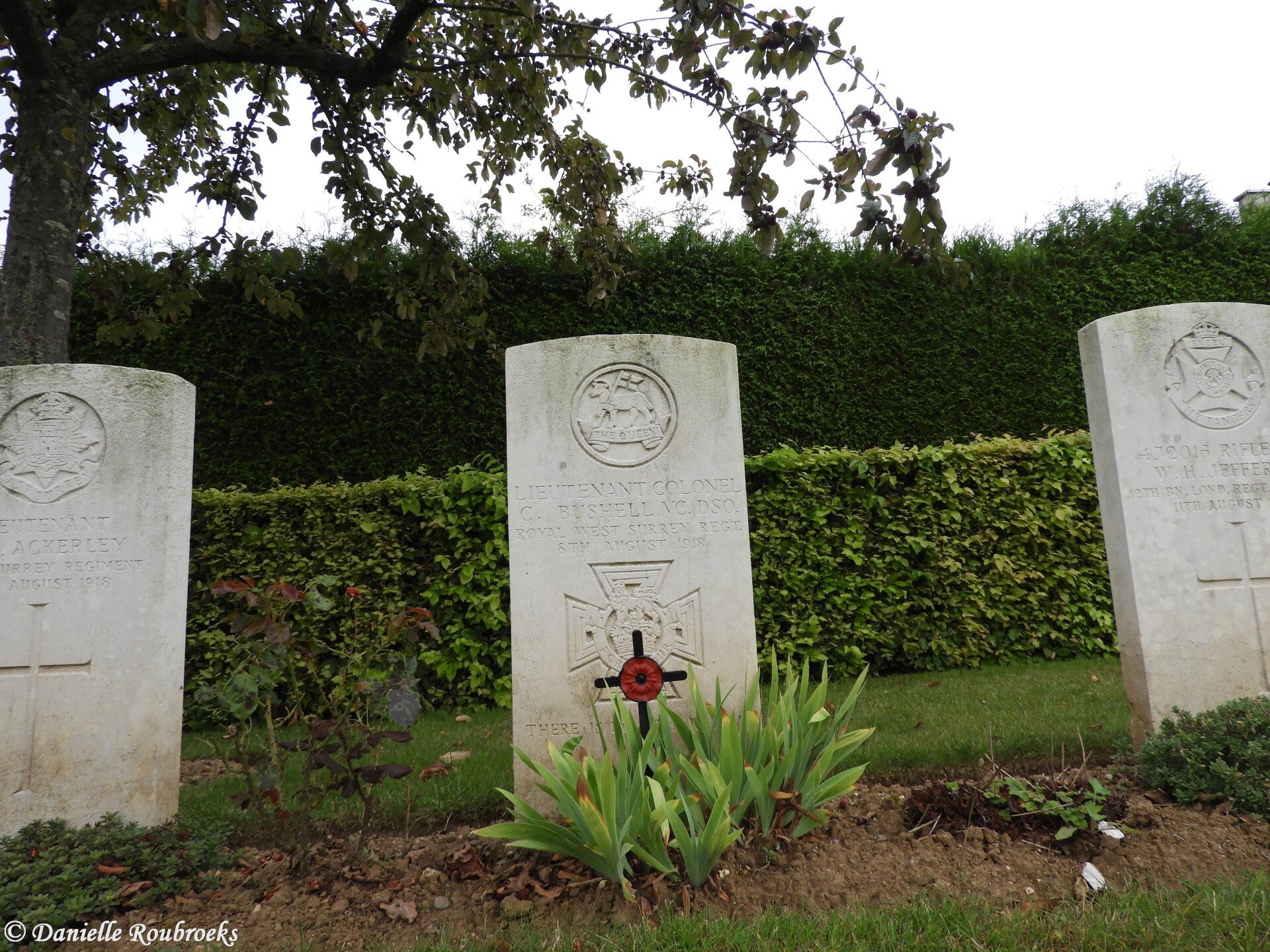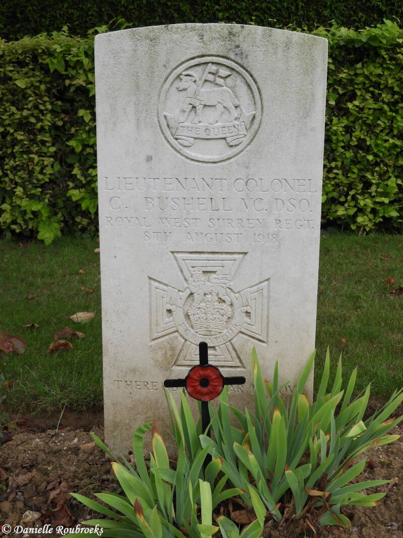 An extract from The London Gazette No. 30667, dated 30th Apl., 1918, records the following:- For most conspicuous bravery and devotion to duty when in command of his battalion. Lt. Col. Bushell personally led "C" Company of his battalion, who were co-operating with an Allied regiment in a counter-attack, in face of very heavy machine gun fire. In the course of this attack he was severely wounded in the head, but he continued to carry on, walking about in front of both English and Allied troops encouraging and re-organising them. He refused even to have his wound attended to until he had placed the whole line in a sound position, and formed a defensive flank to meet a turning movement by the enemy. He then went to brigade headquarters and reported the situation, had his wound dressed, and returned to the firing line, which had come back a short distance. He visited every portion of the line, both English and Allied, in the face of terrific machine-gun and rifle fire, exhorting the troops to remain where they were, and to kill the enemy. In spite of his wounds this gallant officer refused to go to the rear, and had eventually to be removed to the dressing station in a fainting condition. To the magnificent example of energy, devotion and courage shown by their Commanding officer is attributed the fine spirit displayed and the keen fight put up by his battalion not only on the day in question but on each succeeding day of the withdrawal."