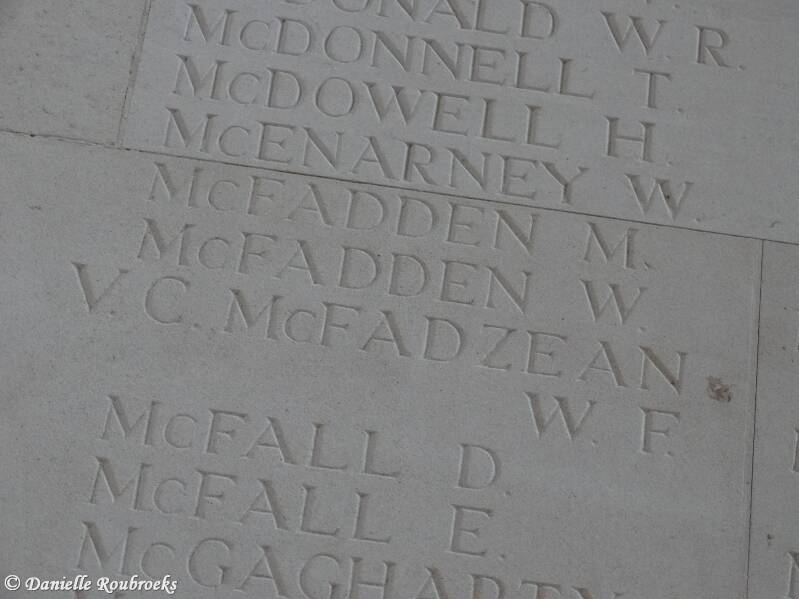 An extract from the London Gazette, dated 8th Sept., 1916, records the following:-"For most conspicuous bravery. While in a concentration trench and opening a box of bombs for distribution prior to an attack, the box slipped down into the trench, which was crowded with men, and two of the safety pins fell out. Private McFadzean, instantly realising the danger to his comrades, with heroic courage threw himself on the top of the bombs. The bombs exploded blowing him to pieces, but only one other man was injured. He well knew his danger, being himself a bomber, but without a moment's hesitation he gave his life for his comrades."