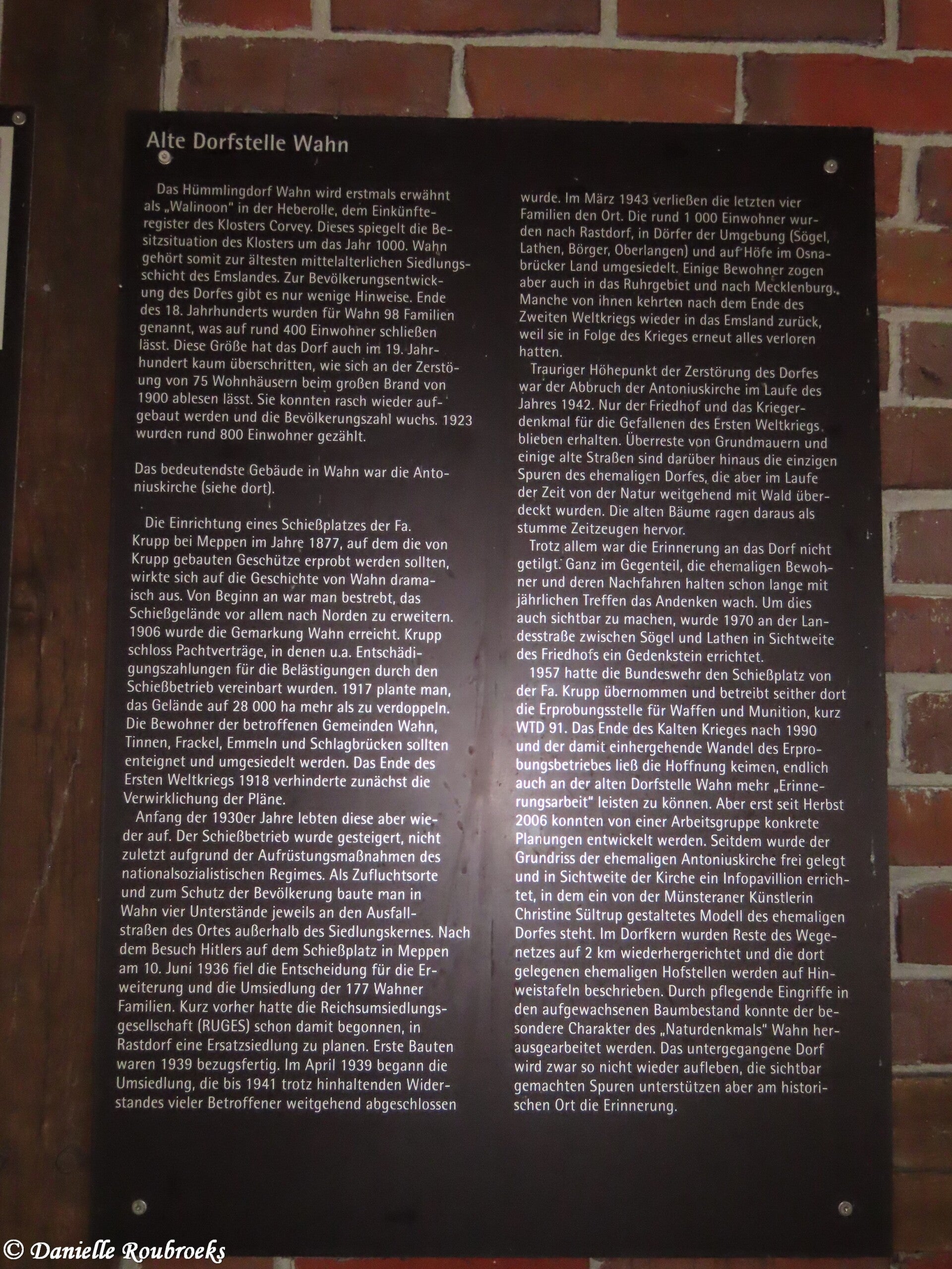 Wahn was a village with, in 1942, approximately 1000 inhabitants. In nearby Meppen, the Schießplatz Meppen was opened in 1877, where guns were tested by the Krupp company.