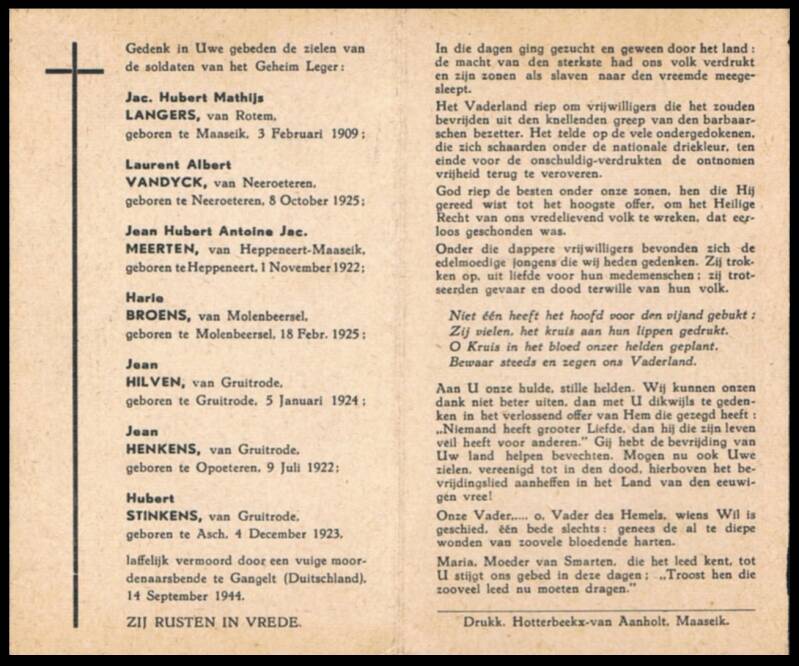 commemorates seven Belgian members of the "Secret Army" (sector Maaseik, shelter Rotem) who were executed here on 14 September 1944.