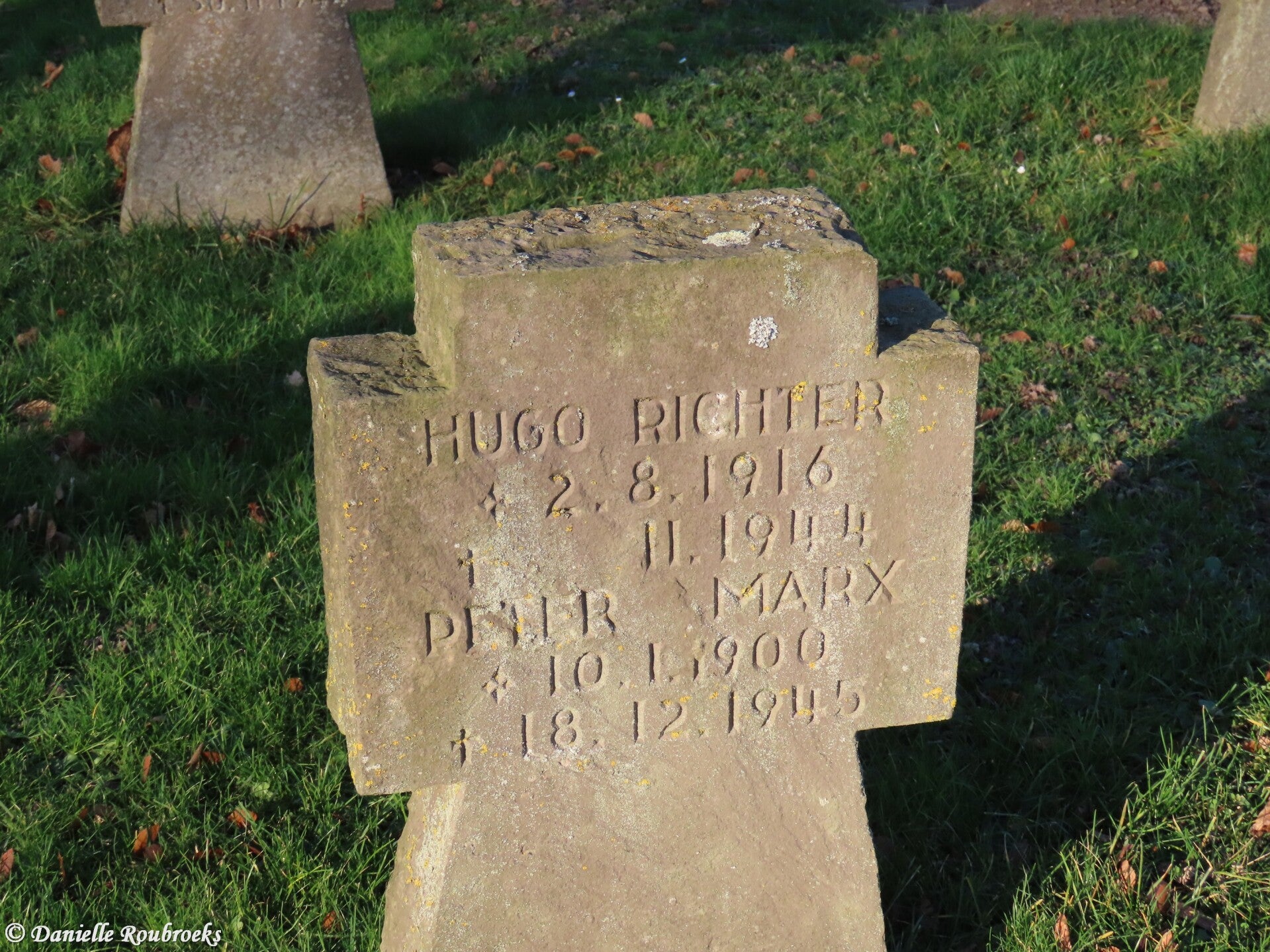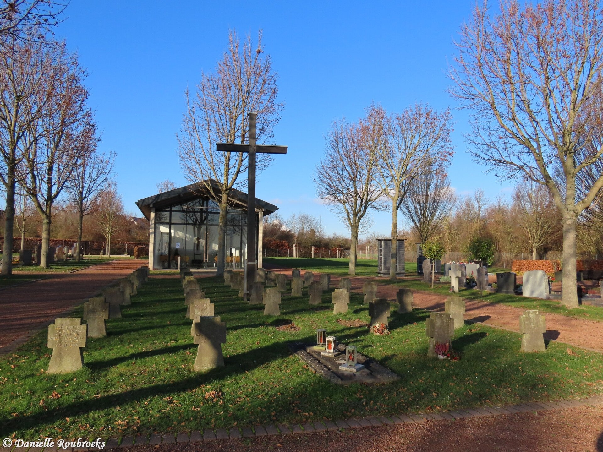 Field of honour with one German soldier from the First World War and 70 German soldiers from the Second World War. There are also two unknown graves from the Second World War. The graves were originally located in the cemetery of Pier. When that village was demolished for the lignite mine, they were transferred in 2010 to this new cemetery in Neu-Pier.