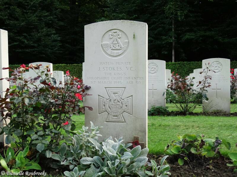 The citation in the London Gazette for 13th April, 1945, contains the following details: In Holland, on 1st March, 1945, during an attack on Kerbenheim, Private Stokes was a member of the leading section of a platoon pinned down by heavy fire from a farm building. Without waiting for orders Private Stokes dashed through the enemy fire, to disappear inside this building. The fire stopped, and he reappeared, wounded in the neck. This valiant action enabled the platoon to advance to the next objective. Private Stokes was ordered back to a Regimental Aid Post, but refused to go. The platoon then encountered heavy fire from a house on the left. Again without waiting for orders, Private Stokes rushed the house by himself and all firing from it ceased. His gallantry enabled his platoon, which he subsequently rejoined bringing five prisoners, to continue the advance. In the final assault Private Stokes, now severely wounded, once more dashed to the objective through intense fire. He finally fell, firing his rifle to the last. It was found that he had been wounded eight times in the upper part of the body. Private Stokes's one object throughout this action was to kill the enemy, at whatever personal risk. His magnificent courage, devotion to duty, and splendid example inspired all around him, and ensured the success of the attack at a critical moment; moreover, his self-sacrifice saved his Platoon and Company heavy casualties.