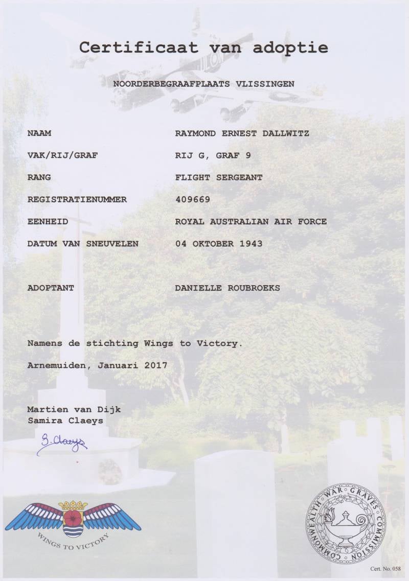 The body of Flt/Sgt. Raymond Ernest Dallwitz RAAF washed ashore in Zoutelande on October 4, 1943 and buried October 6, 1943 at the Noorderbegraafplaats in Vlissingen. He was not identified right away.