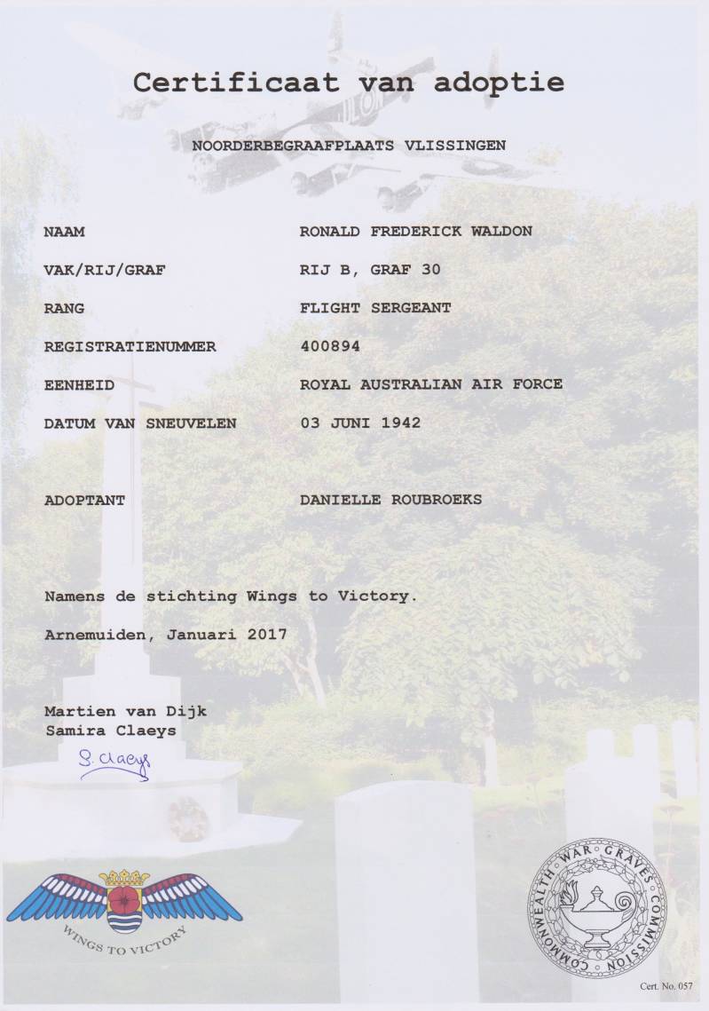 On June 2nd 1942 Ronald and the crew of Wellington IV - Z1394 – UV Q took off from Breighton Air Base, UK, at 23.26 for a mission to Essen, Germany. After the target was bombed they were flying at low altitude (200-300ft) over the Dutch coast. Suddenly the aircraft crashed without warning into the sea and sank immediately before the coast of Wemeldinge, Oosterschelde, (The Netherlands) in the night of June 3rd.