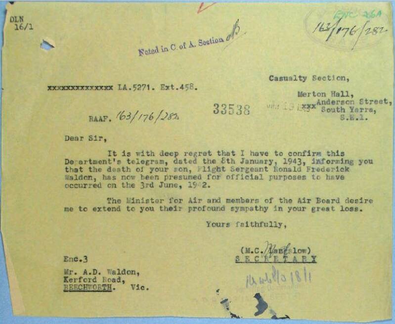 June 18, 1942 a letter was sent to Ronalds father informing him that his son was missing.