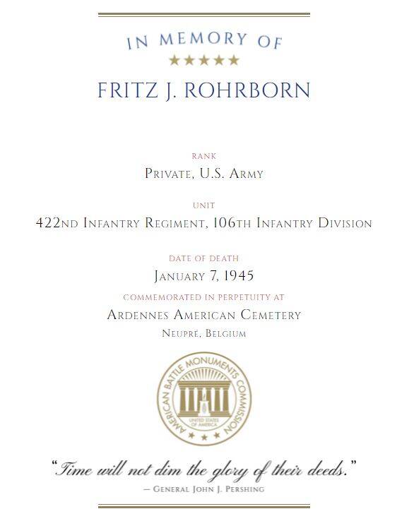 On Saturday 30th March 2019 I had the honor to meet Joanne and Ralph Thomas, Joanne is the niece of Fritz Rohrborn and this was the first time she visited his grave. Mike Yasenchak, the superintendent, put some Normandy sand in the letters so they stood out on the headstone.