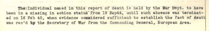 Missing in action status from 19 Sept 1944 until 16 Feb 1945 when evidence considered sufficient to establish the fact of death was received by the Secretary of War from a commander in the European Area.
