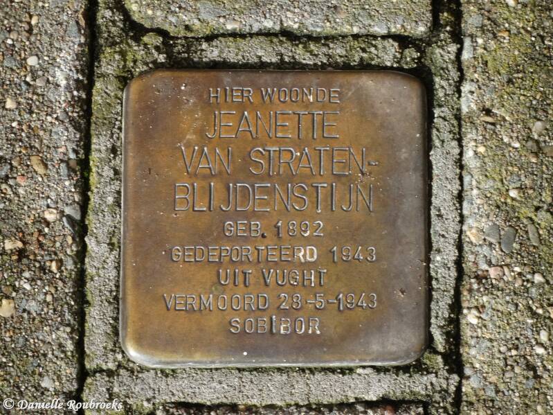 Jeannette van Straten-Blijdenstijn was born in Ophemert on 19 February 1892, died in Sobibor, 28 May 1943. She reached the age of 51 years. Jeannette was a daughter of Hijman van Bledenstijn and Judith Docters.