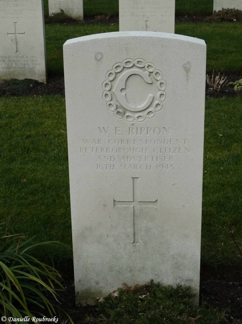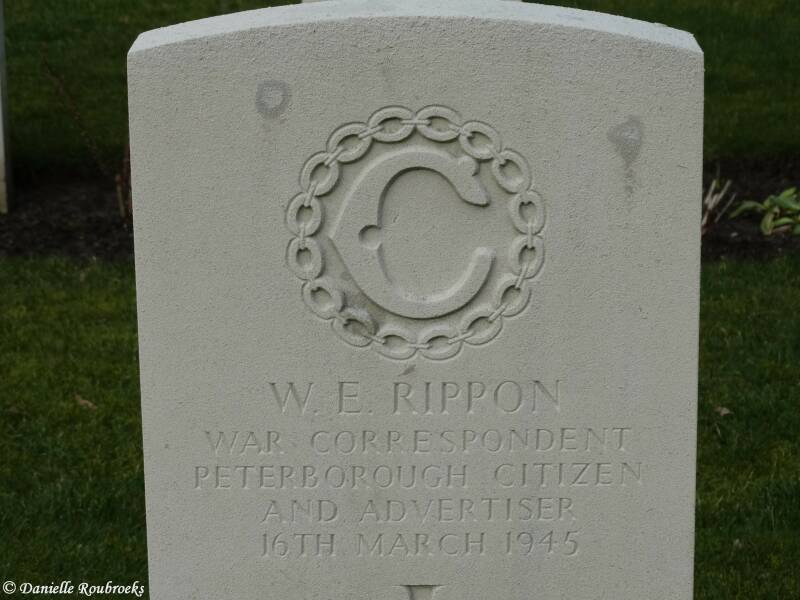 William Ewart Rippon was a war correspondent for the Peterborough Citizen and Advertiser. He traveled with others in a personnel carrier when a tank crossed their path. The carrier had to swerve and rammed a tree. Some of the occupants died instantly, but Rippon was taken to the St. Jozef hospital in Venlo. There he died on March 16, 1945 from his injuries. Rippon is buried at the British War Cemetery in Venray, grave VII-E-6.