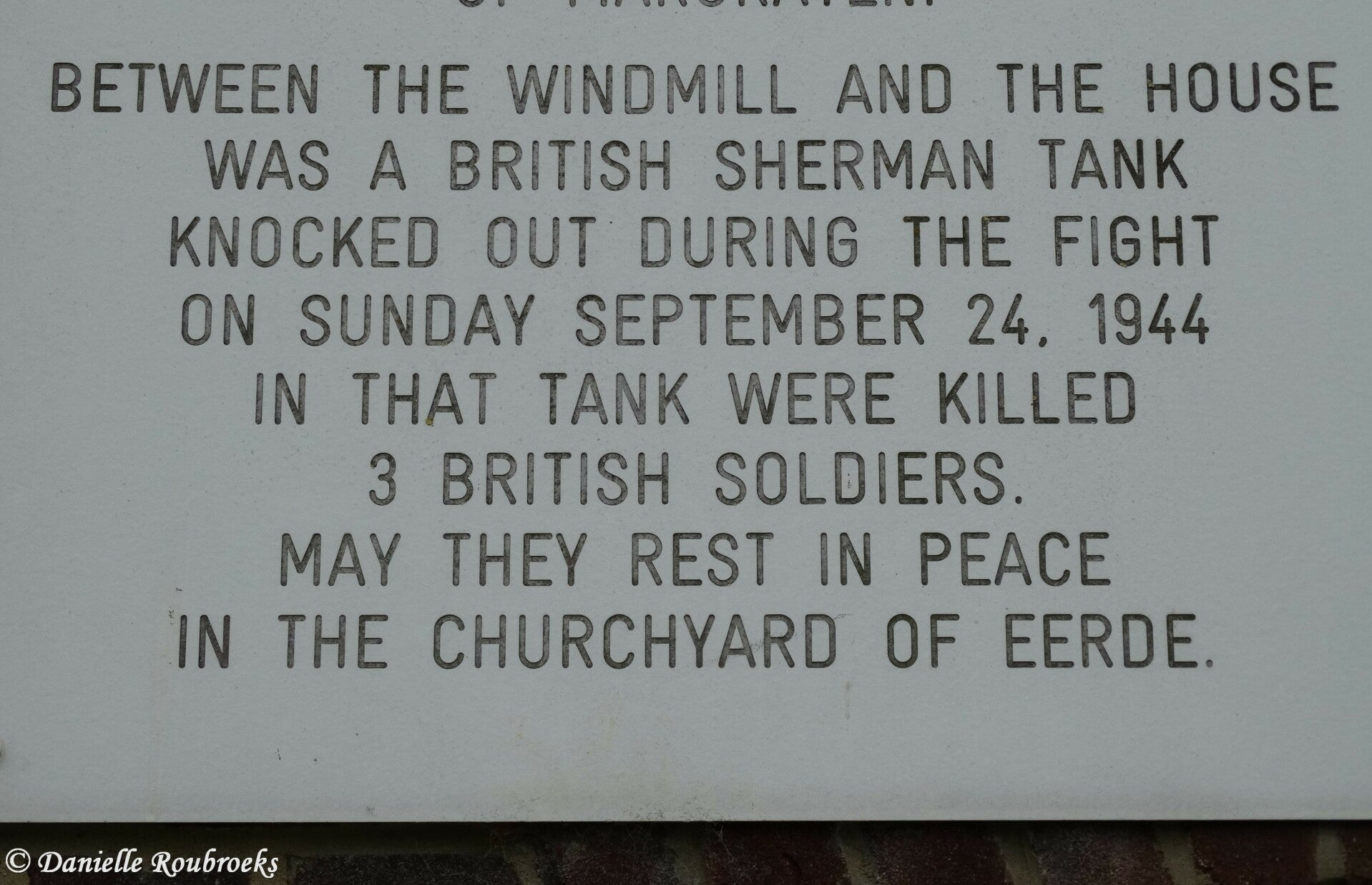 The Windmill of Eerde was destroyed on 24 September 1944 during the battle for the sand dunes. On the mill is a plaque with the names of the fallen soldiers.