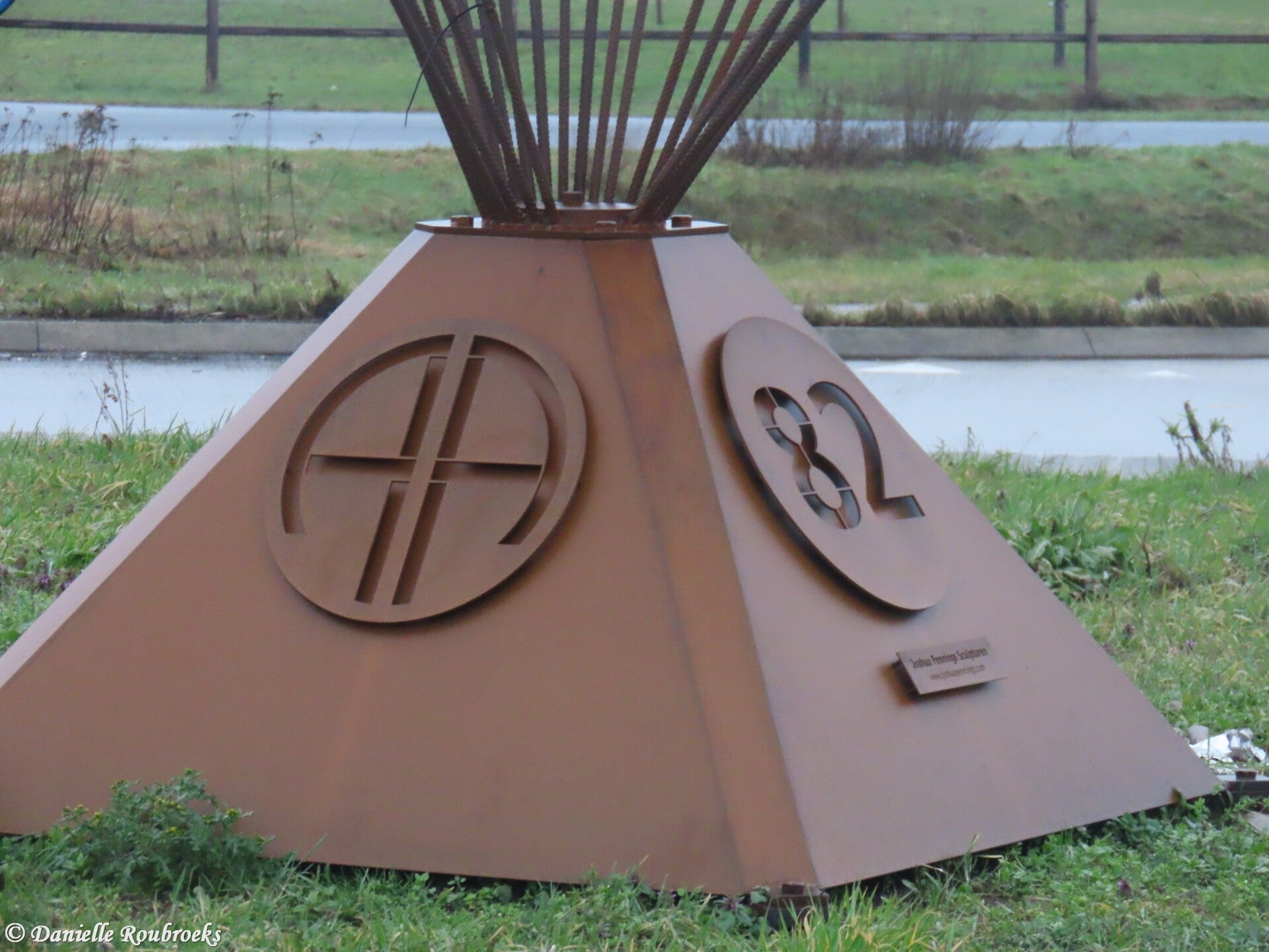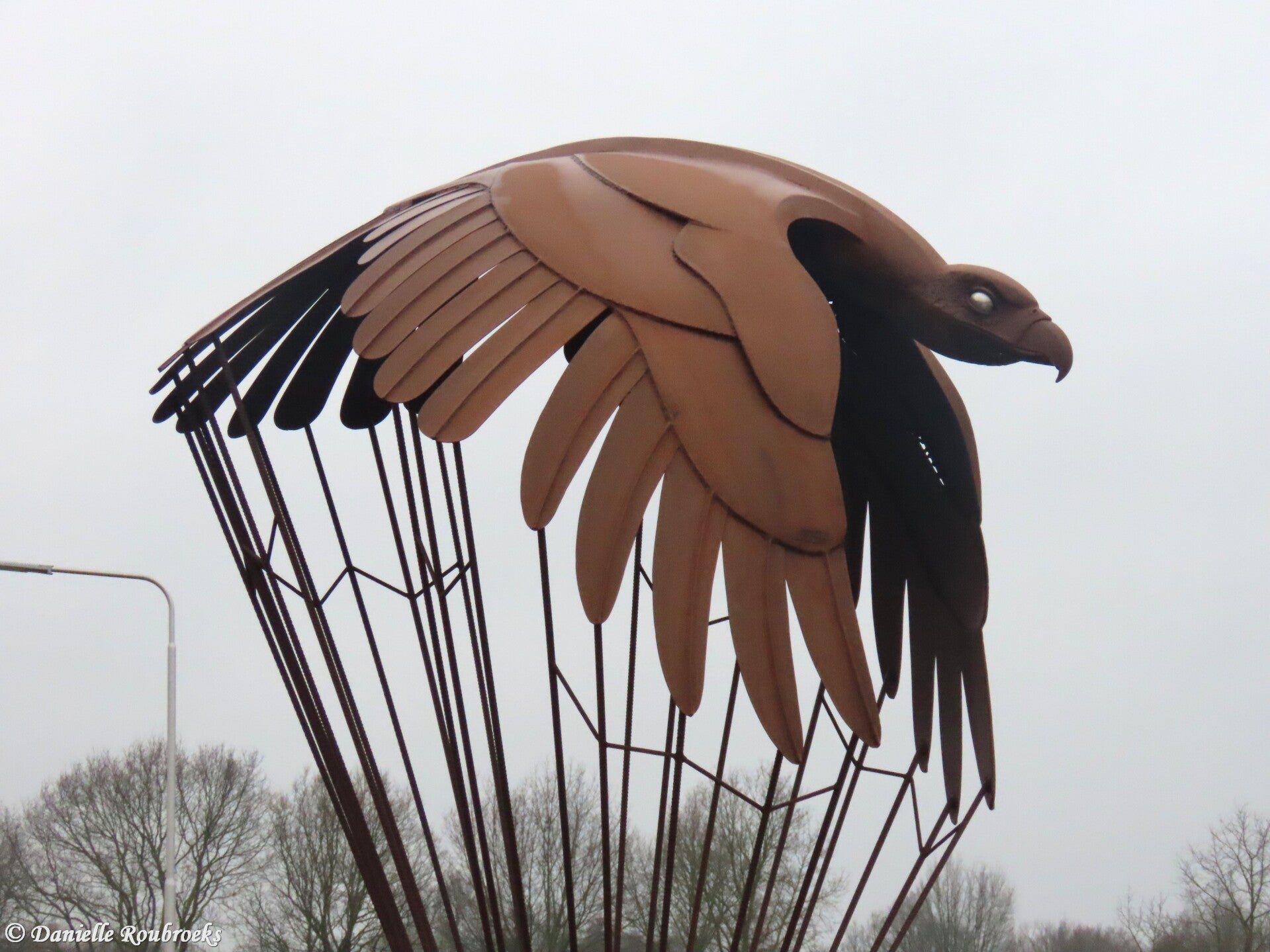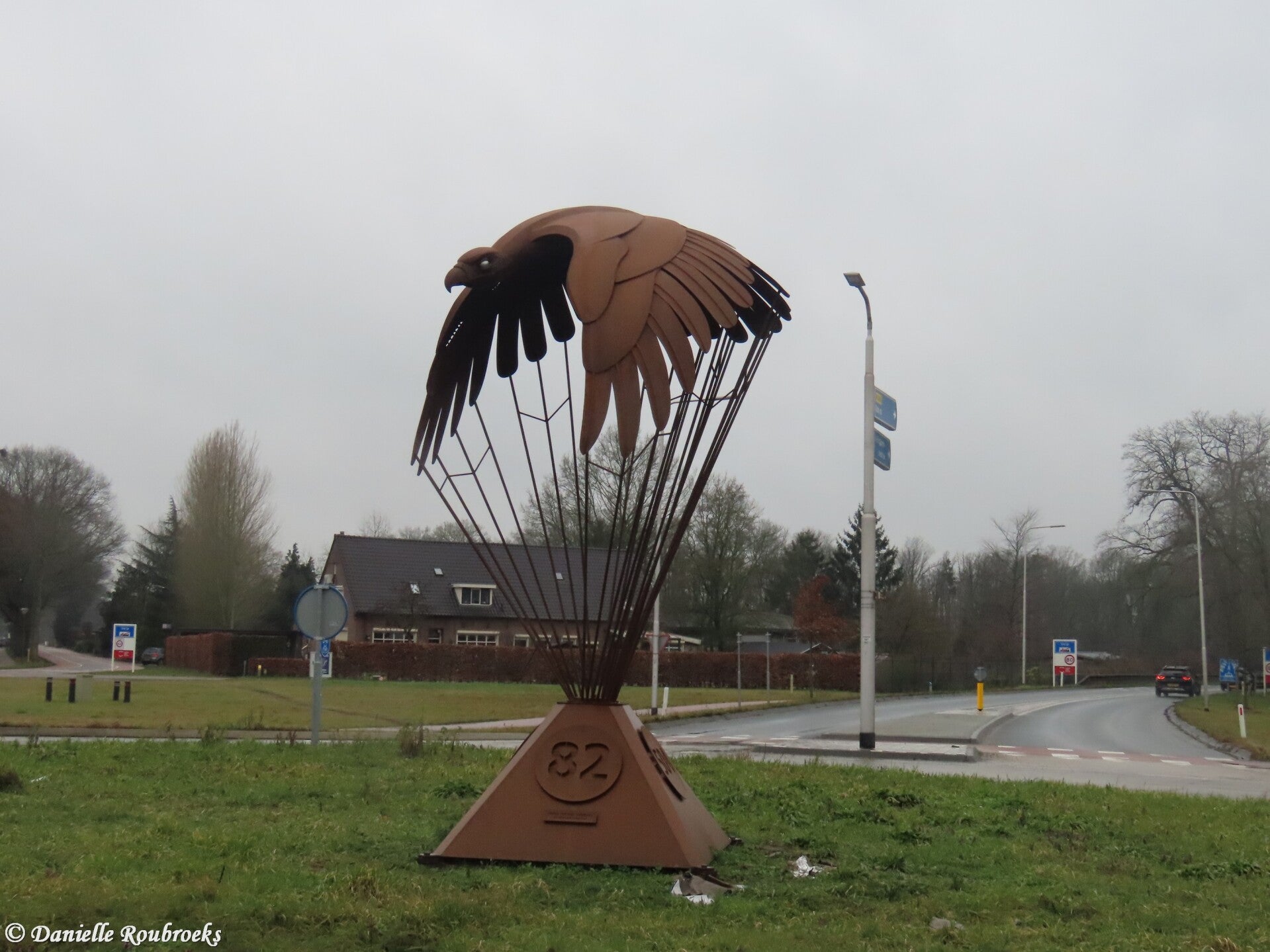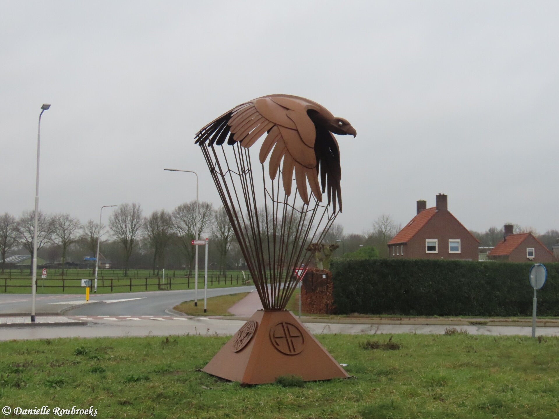 The memorial comprises a four-meter-high statue in wrought iron. A stylized eagle, flying northeast toward Grave city center, forms the cupola of a parachute joined by suspension lines down to a four-sided pyramid-form base.