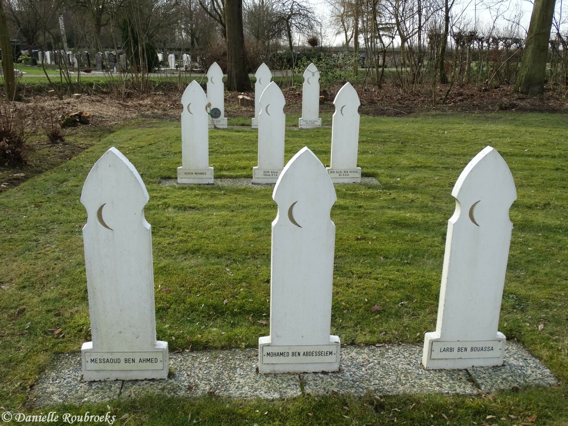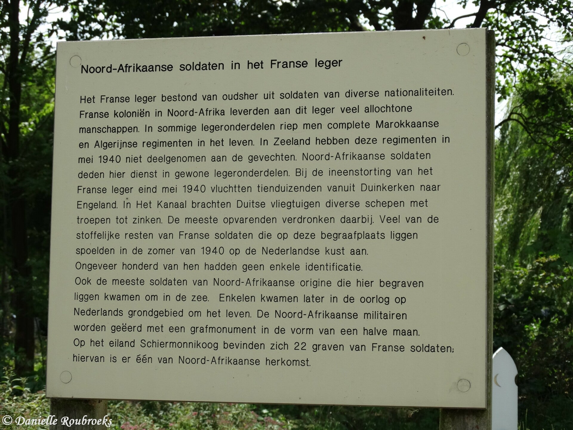 French colonies in North Africa provided many immigrant troops. In some army units complete Moroccan and Algerian regiments were created. In Zeeland, these regiments did not participate in the fighting in May 1940. North African soldiers served here in regular army units. When the French army collapsed in May 1940, tens of thousands fled from Dunkirk to England. German planes sunk several ships with troops in the canal. Most of the passengers drowned. Many of the remains of French soldiers buried in this cemetery washed up on the Dutch coast in the summer of 1940. About a hundred of them had no identification whatsoever. Most soldiers of North African origin who are buried here also died in the sea. Some died on Dutch soil later in the war. The North African military are honored with a crescent-shaped monument in the shape of a crescent.