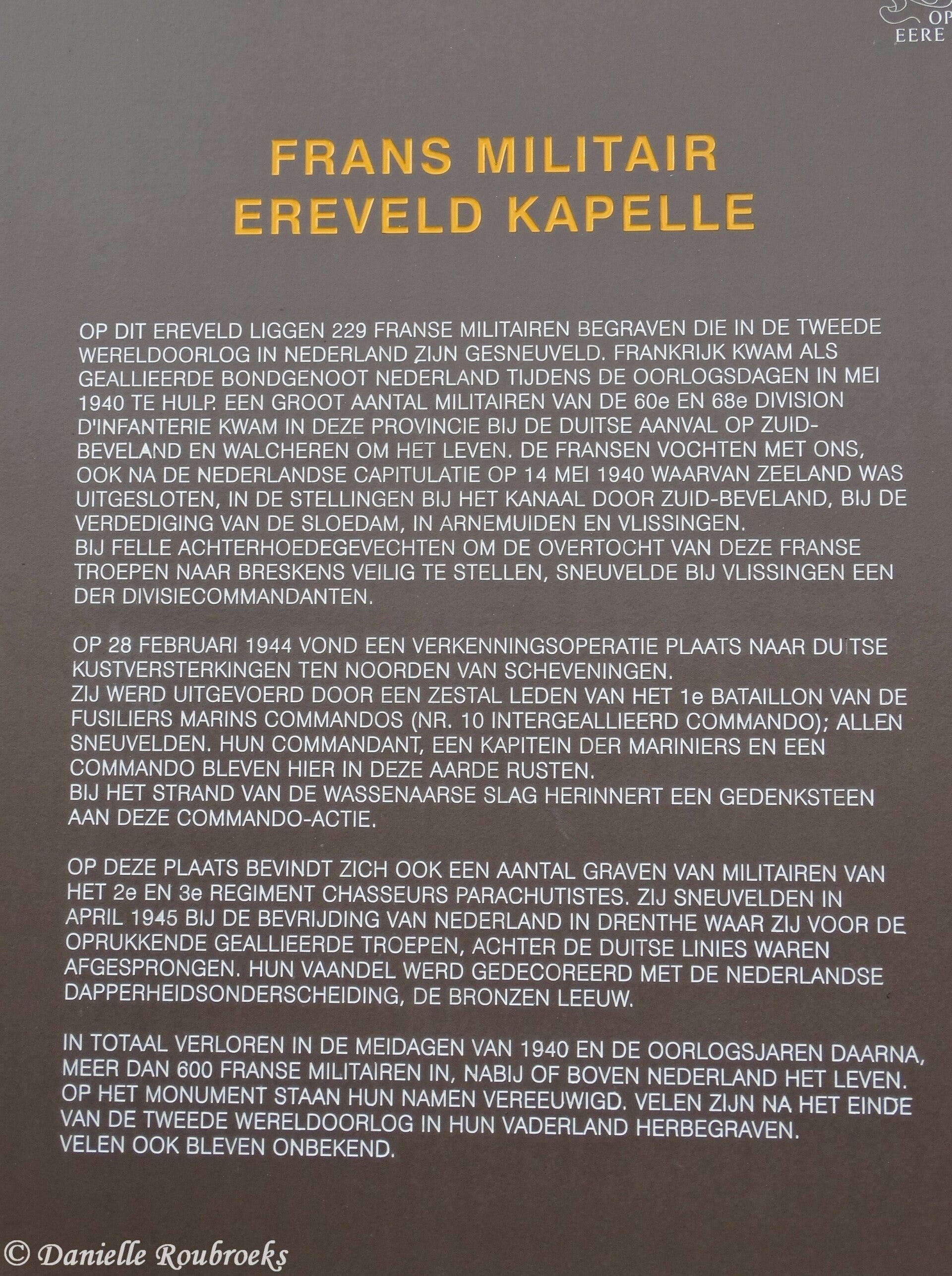 A large number of soldiers of the 60th and 68th division D'infanterie died in this province during the German attack on South Beveland and Walcheren. The French fought there even after the Dutch capitulation on May 14, 1940 from which Zeeland was excluded, in the positions near the canal through Zuid-Beveland, in the defense of the Sloedam and Arnemuiden and Vlissingen. In fierce rearguard action to secure the crossing of the French troops to Breskens, one of the division commanders died at Vlissingen. On February 28, 1944, a reconnaissance operation took place to German coastal fortifications north of Scheveningen. It was carried out by six members of the 1st battalion of the Fusiliers Marine commandos (No. 10 Interallied Command), who all died. Their commander, a captain of the marines and a command stayed here in this earth. At the beach of the Wassenaar battle, a memorial commemorates this commando action.