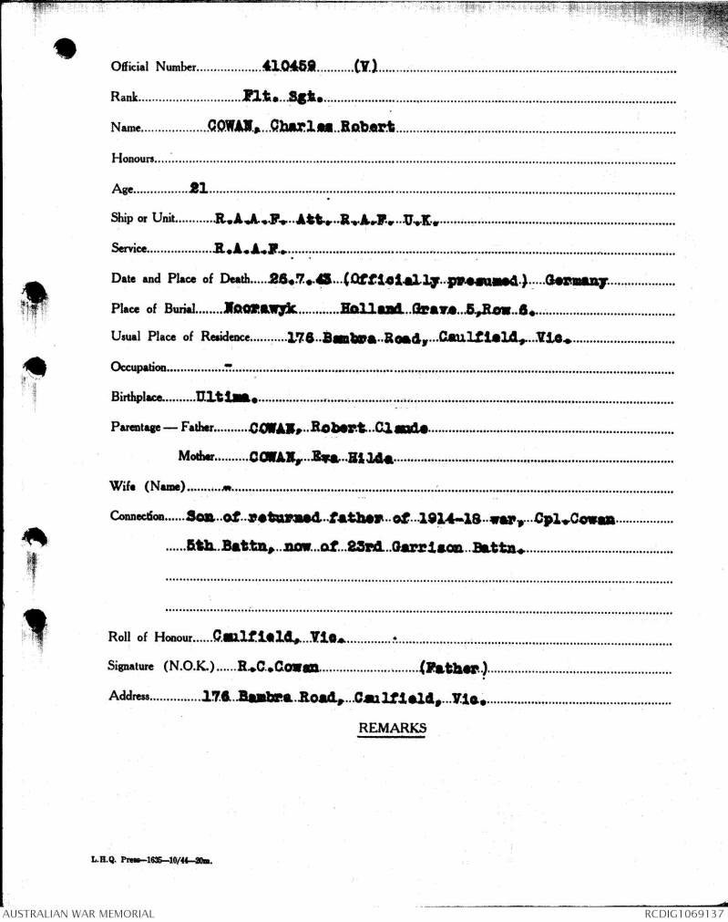 Flight Sergeant Charles Robert COWAN (410459) RAAF