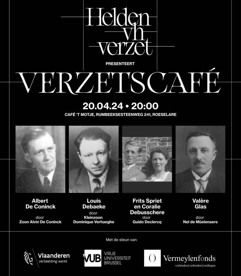 Helden van het verzet and Vermeylenfonds Roeselare: Resistance Café Roeselare, a storytelling evening with 4 inspiring stories of resistance from ordinary people against the Nazi occupier.